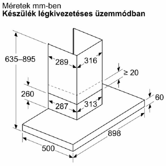 -méretek légkivezetéses üzemmódban (szélesség x magasság x mélység): 898 mm x 635-895 mm x 500 mm