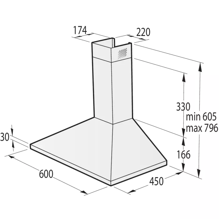 -Kivezetett üzemmód: a légtechnikai rendszer teljes hossza rendelkezzen azzal az áteresztő képességgel (megfelelő keresztmetszettel) amelyet a páraelszívó gyári csatlakozó csonka meghatároz. A nyomvonal kialakításánál a lehető legrövidebb, szűkítés-mentes útvonal kialakítása javasolt.