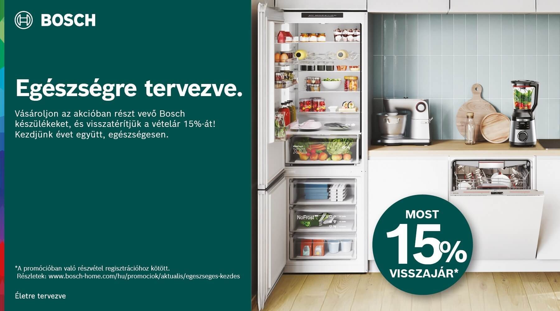 Vásároljon a promócióban szereplő Bosch hűtőt,gőz- és AirFry funkcióval is rendelkező sütőt vagy egészségét támogató kiskészülékeket 2026.01.01. és 02.28. között, és a gyártó visszatérít Önnek 15%-ot a vételárból!